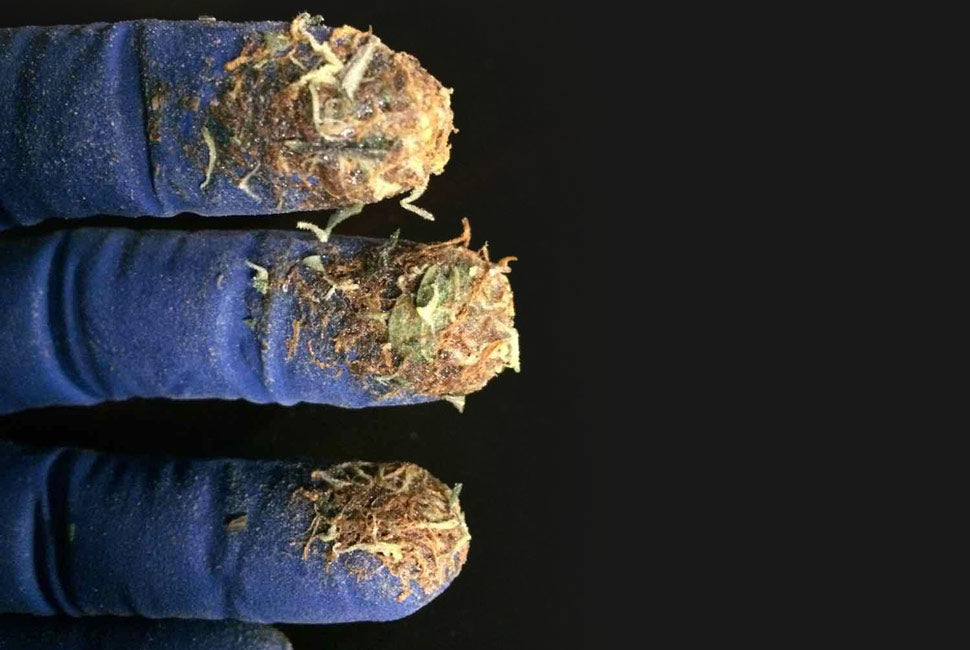 On the left is a scissor trimmed nug trimmed at typical speed. Swift cuts result in some chopped trichome heads.